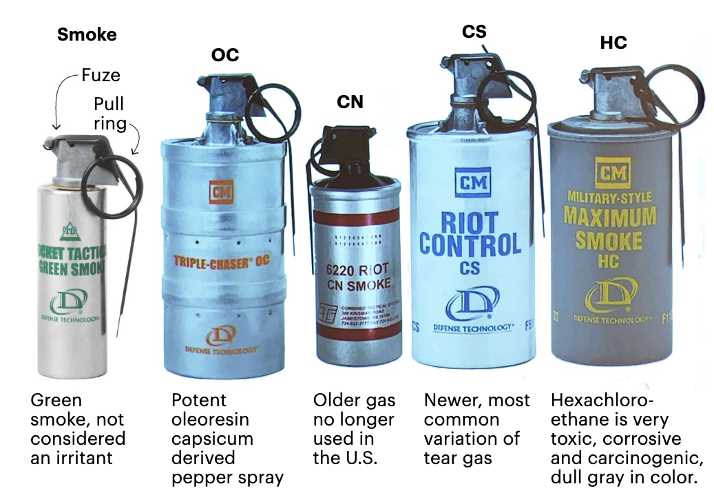 Tear gas and pepper spray are among a range of substances known as less-lethal crowd control agents. Chemical irritants can injure any part of the body, including eyes, skin, lungs, and mucus membranes.